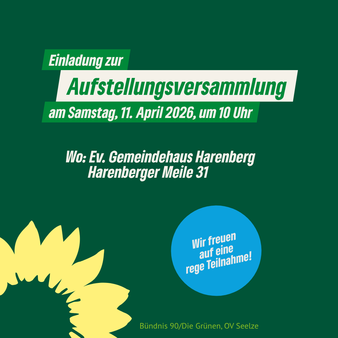 Am Samstag 11.04. um 10:00 treffen wir uns zu einer Mitgliederversammlung. Der Ort wird noch bekannt gegeben. Der Hauptpunkt der Tagesordnung wird die Listenaufstellung für die Kommunalwahl sein. Wir suchen auch noch Kandidaten für die Ortsräte. Sie müssen nicht zwingend Mitglieder bei den Grünen sein.